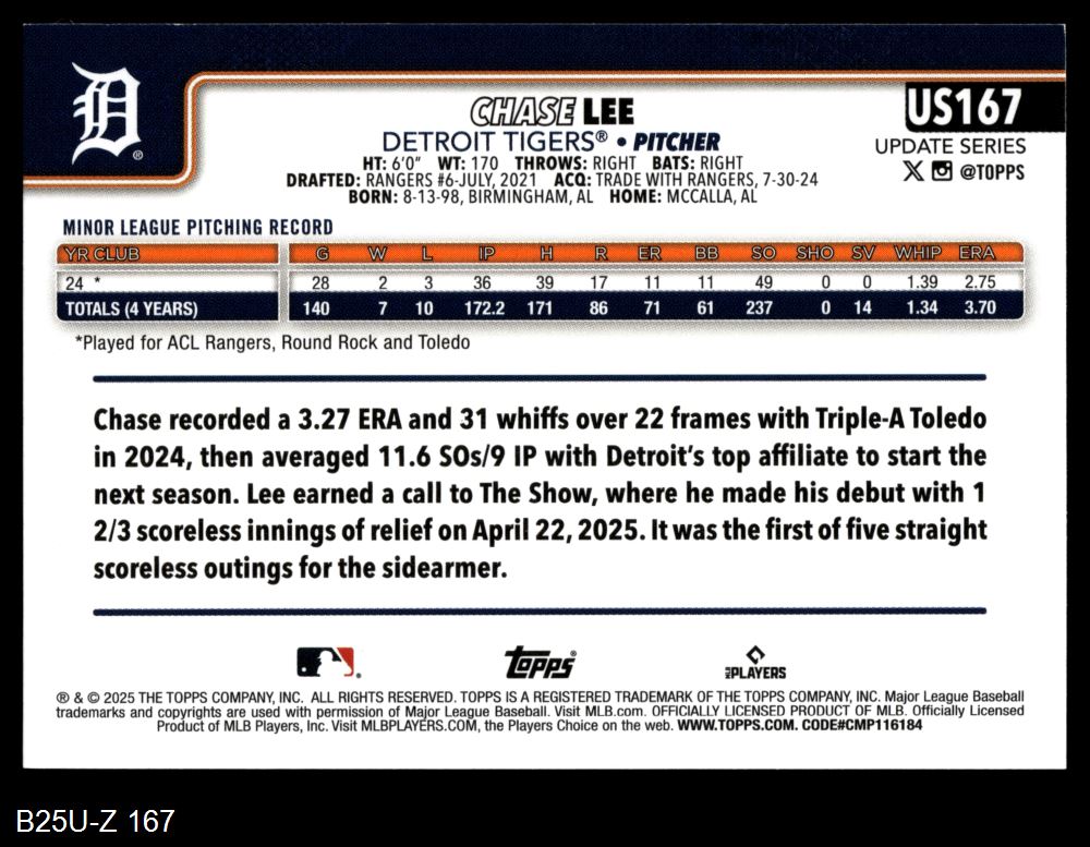 2025 Topps Update #167 Chase Lee 8 - NM/MT
