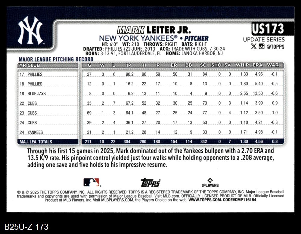 2025 Topps Update #173 Mark Leiter Jr. 8 - NM/MT