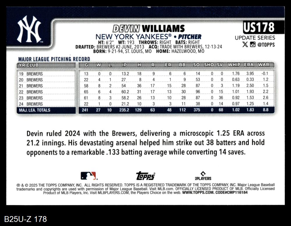 2025 Topps Update #178 Devin Williams 8 - NM/MT