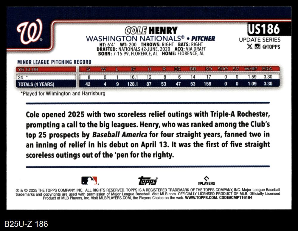 2025 Topps Update #186 Cole Henry