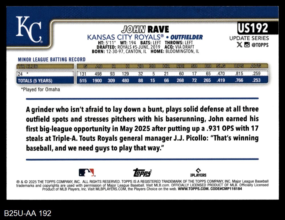 2025 Topps Update #192 John Rave 8 - NM/MT