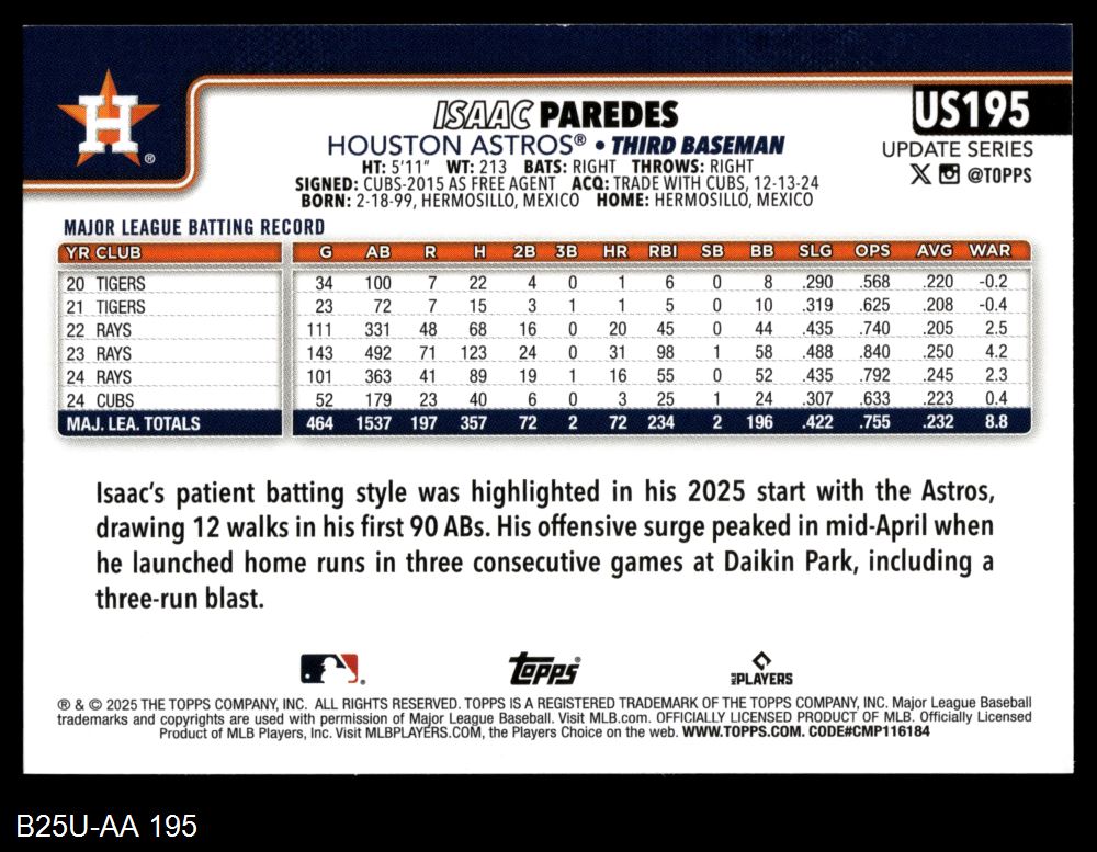 2025 Topps Update #195 Isaac Paredes 8 - NM/MT