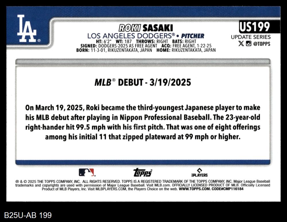 2025 Topps Update #199 - Roki Sasaki Rookie Debut 8 - NM/MT