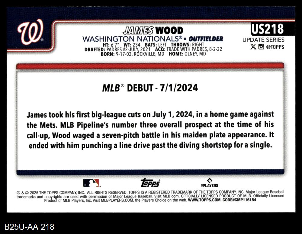 2025 Topps Update #218 - James Wood Rookie Debut 8 - NM/MT