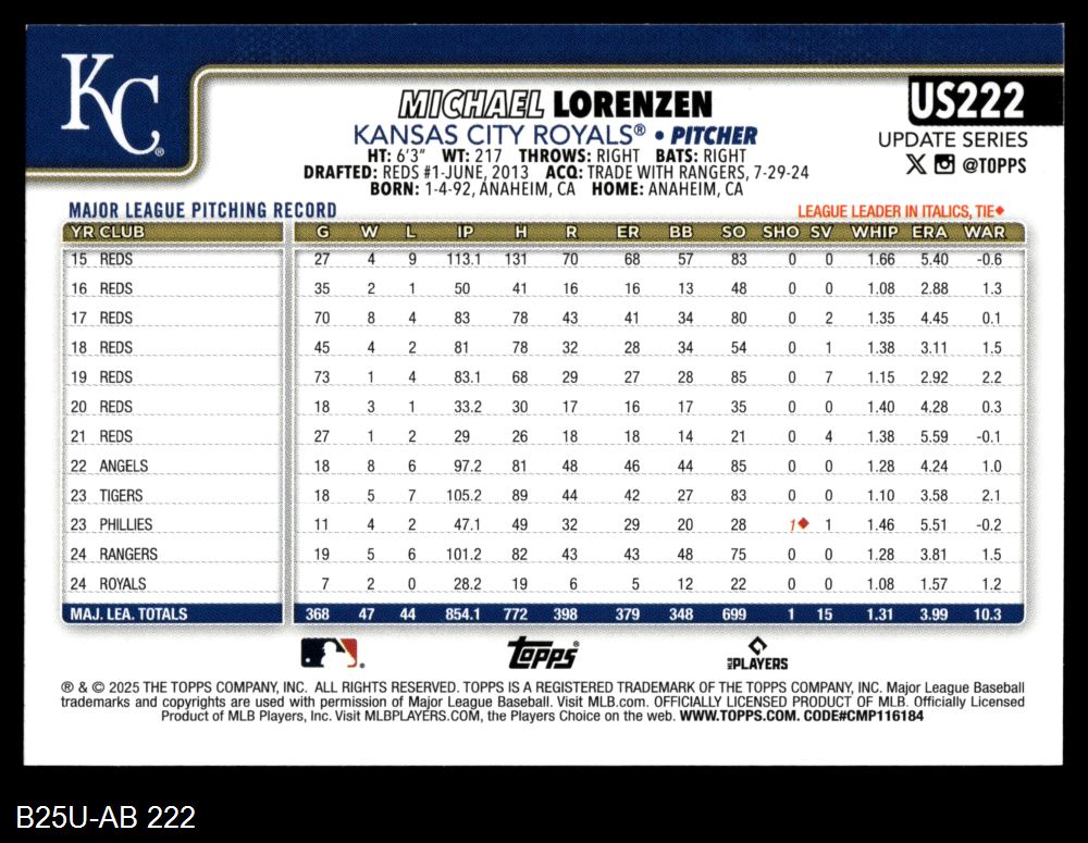 2025 Topps Update #222 Michael Lorenzen 8 - NM/MT