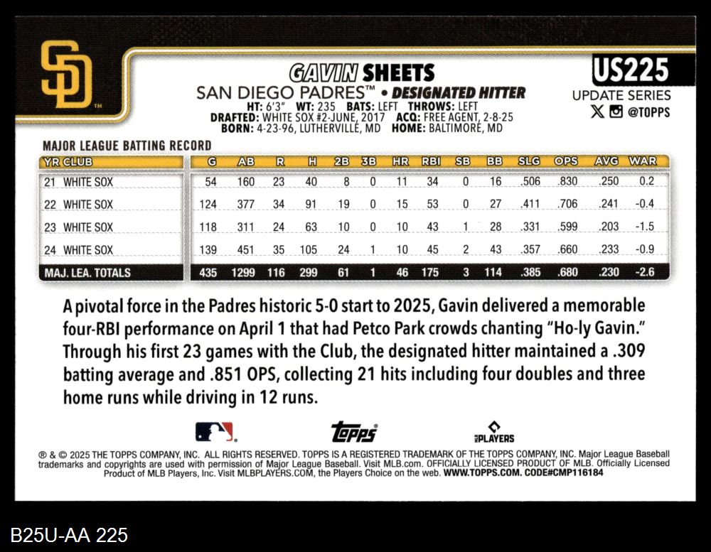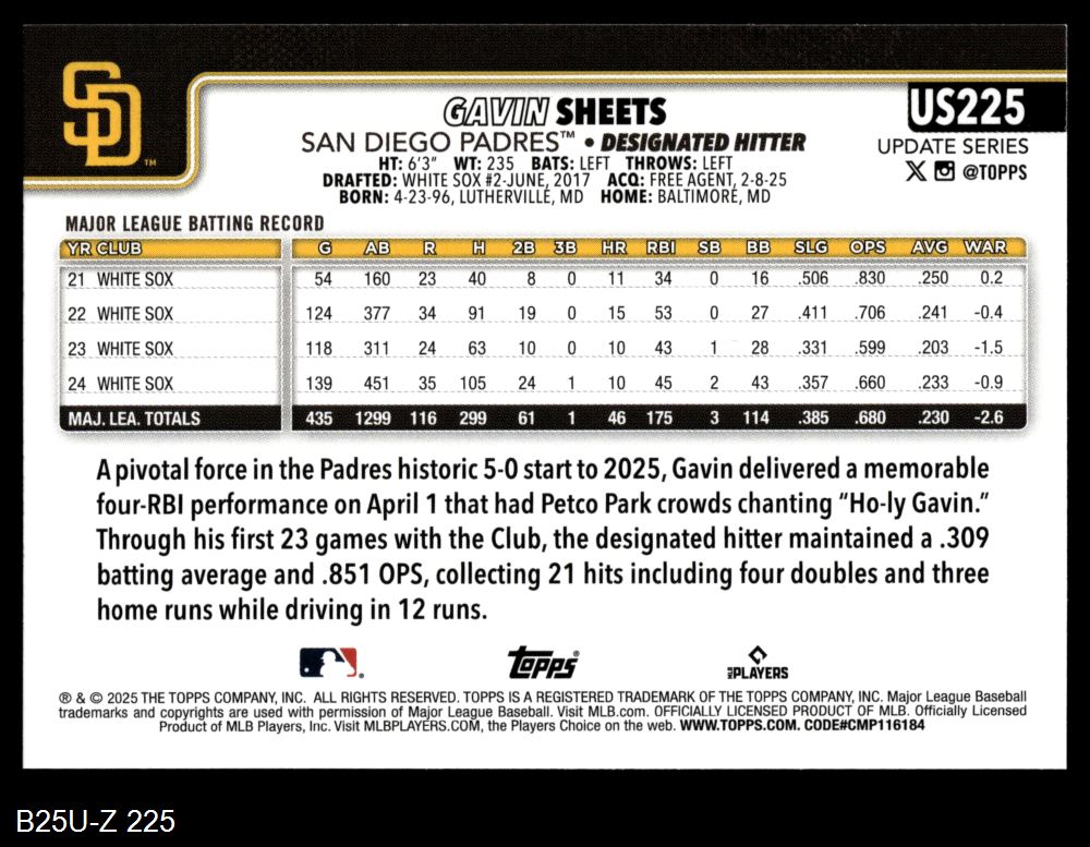 2025 Topps Update #225 Gavin Sheets 8 - NM/MT
