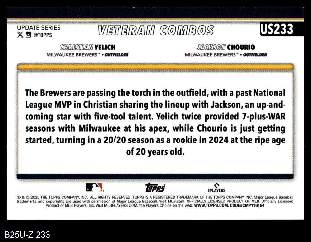 2025 Topps Update #233 - Christian Yelich / Jackson Chourio Combo Card 8 - NM/MT