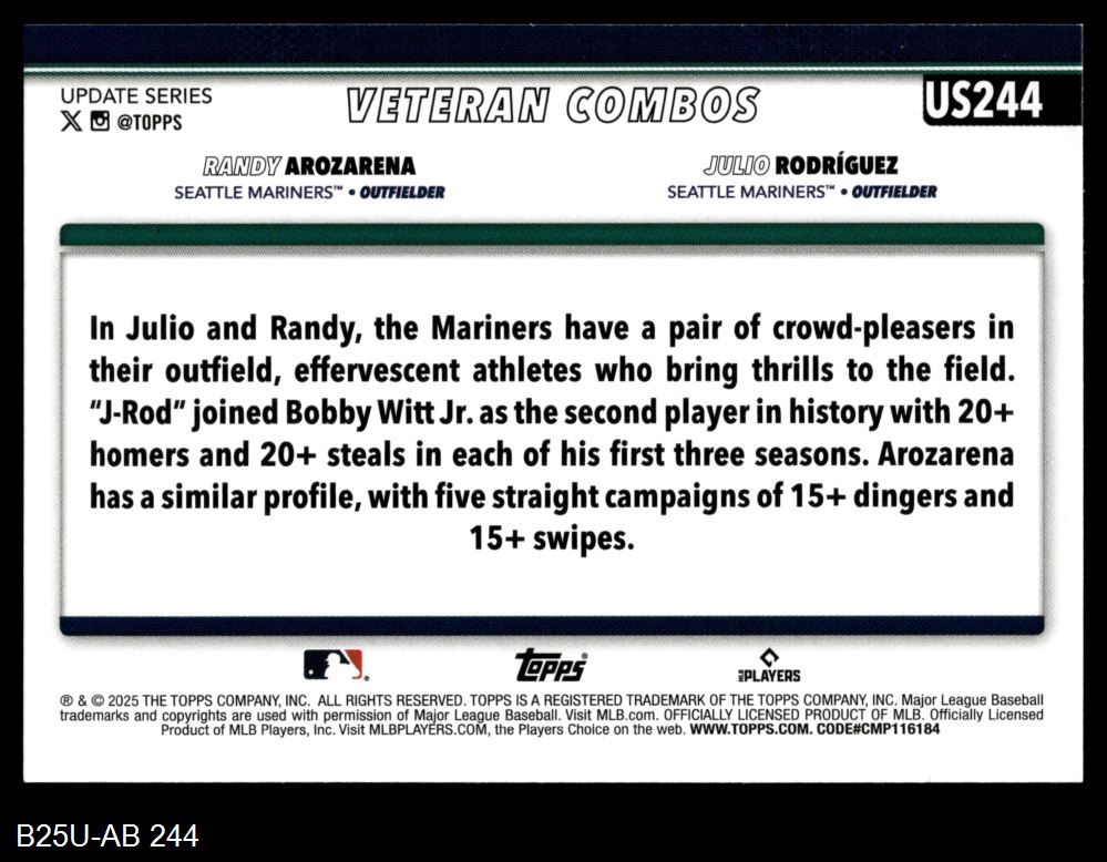 2025 Topps Update #244 - Julio Rodriguez / Randy Arozarena Combo Card 8 - NM/MT