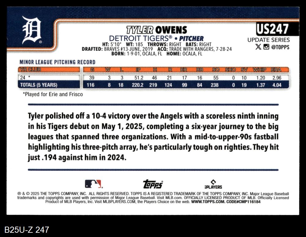 2025 Topps Update #247 Tyler Owens 8 - NM/MT