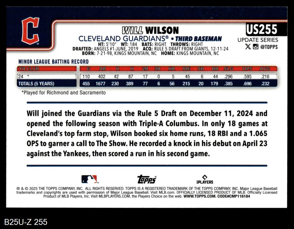 2025 Topps Update #255 Will Wilson 8 - NM/MT