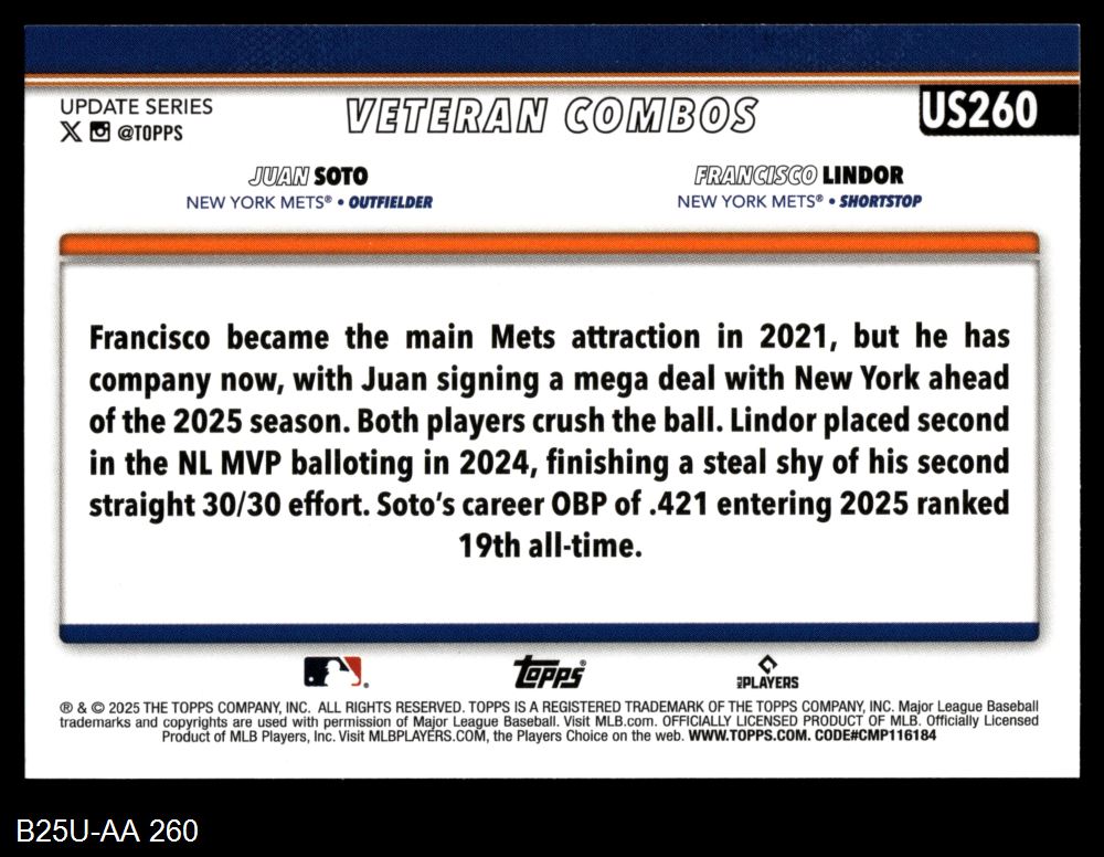 2025 Topps Update #260 - Francisco Lindor / Juan Soto Combo Card 8 - NM/MT
