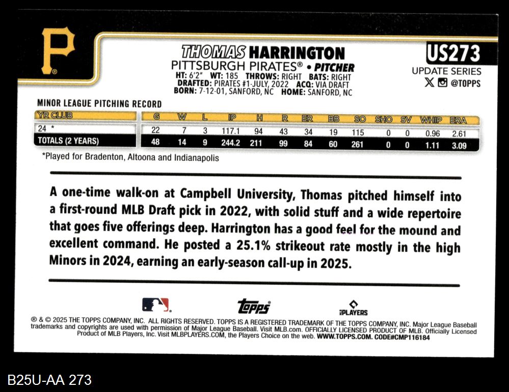 2025 Topps Update #273 Thomas Harrington 8 - NM/MT