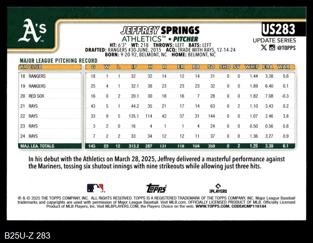 2025 Topps Update #283 Jeffrey Springs 8 - NM/MT