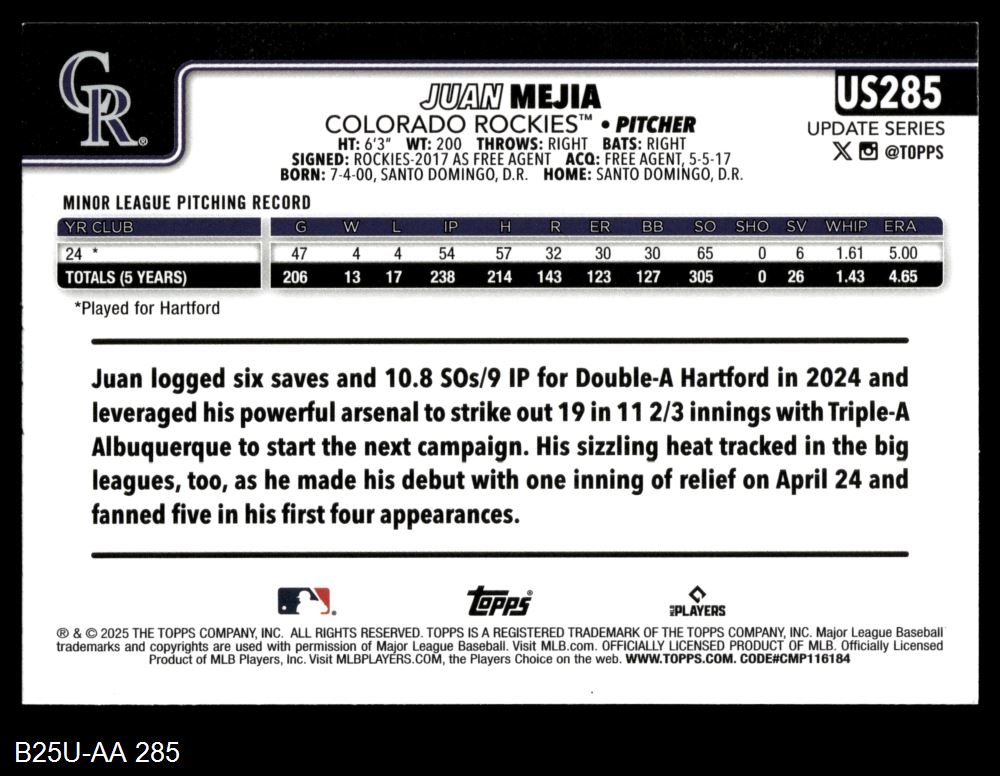 2025 Topps Update #285 Juan Mejia 8 - NM/MT
