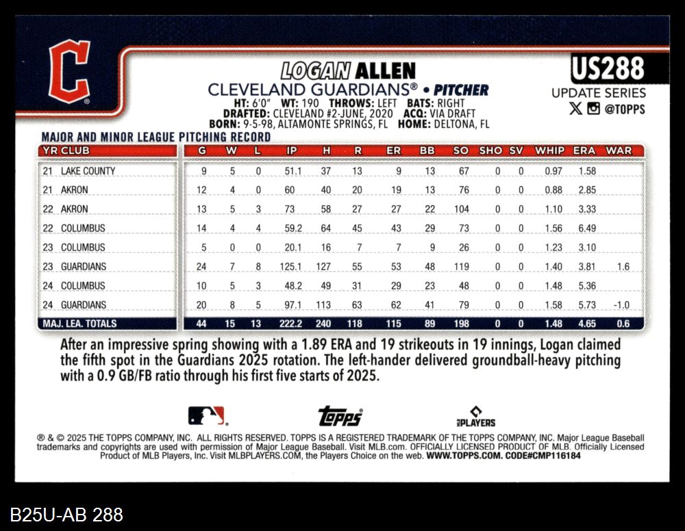 2025 Topps Update #288 Logan Allen 8 - NM/MT