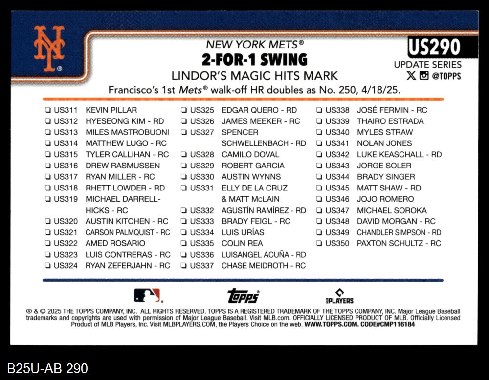 2025 Topps Update #290 - Francisco Lindor Season Highlights 8 - NM/MT
