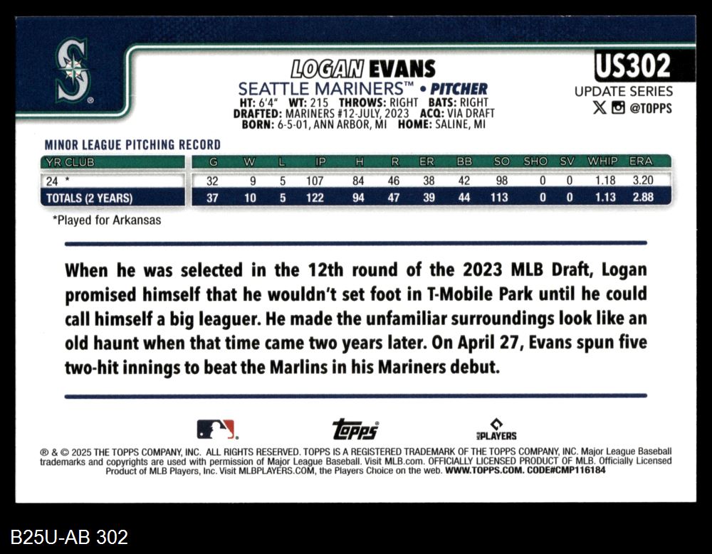 2025 Topps Update #302 Logan Evans