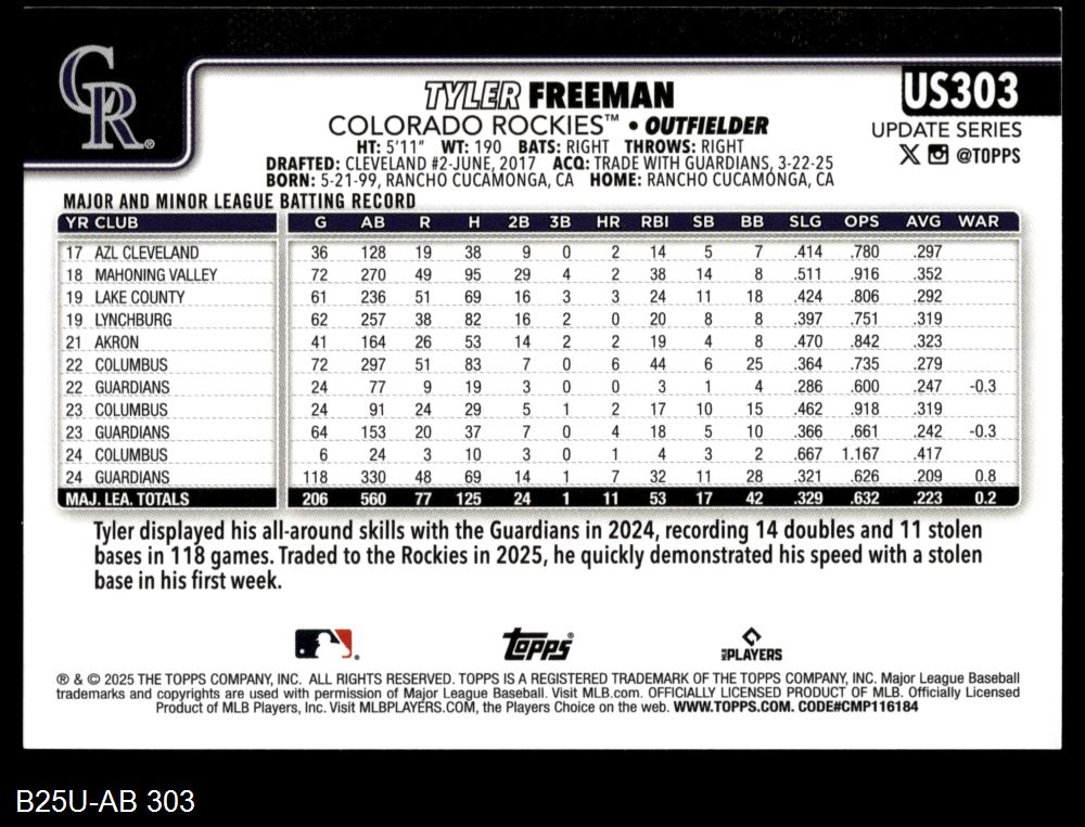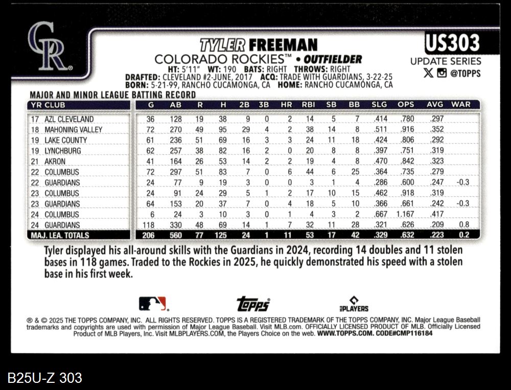 2025 Topps Update #303 Tyler Freeman 8 - NM/MT