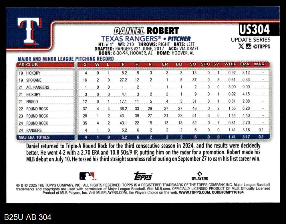 2025 Topps Update #304 Daniel Robert 8 - NM/MT