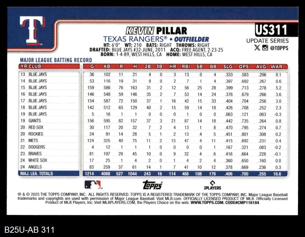 2025 Topps Update #311 Kevin Pillar 8 - NM/MT