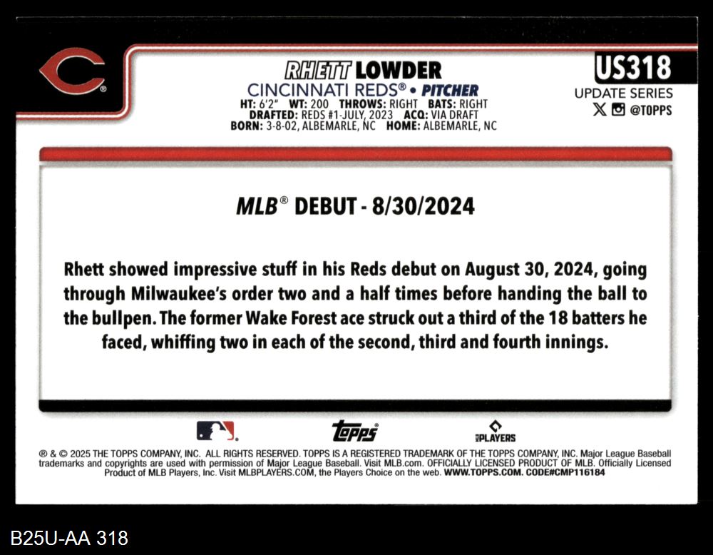 2025 Topps Update #318 - Rhett Lowder Rookie Debut 8 - NM/MT