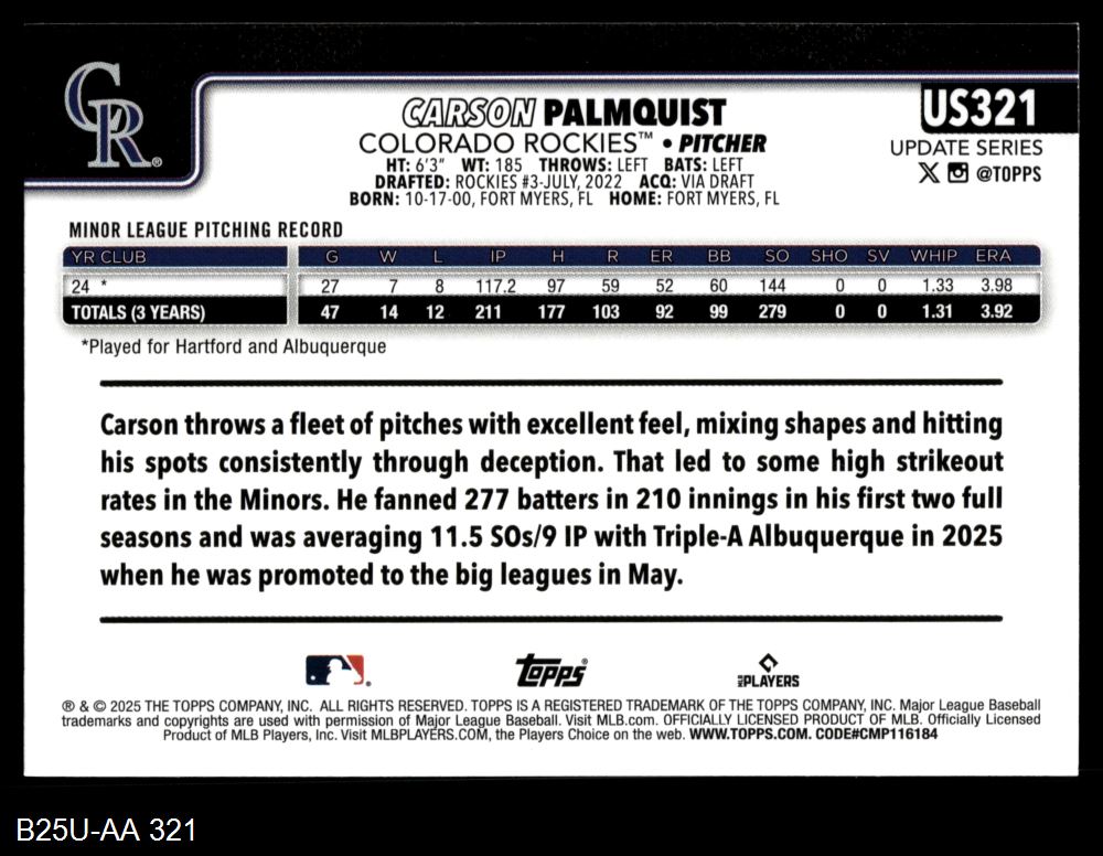 2025 Topps Update #321 Carson Palmquist