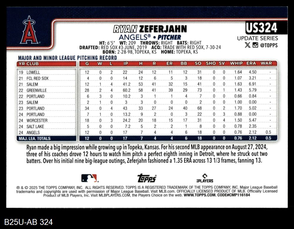 2025 Topps Update #324 Ryan Zeferjahn 8 - NM/MT