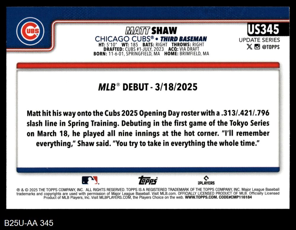 2025 Topps Update #345 - Matt Shaw Rookie Debut 8 - NM/MT