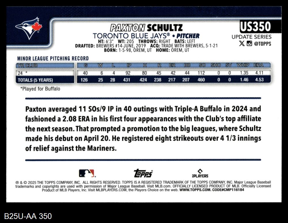 2025 Topps Update #350 Paxton Schultz