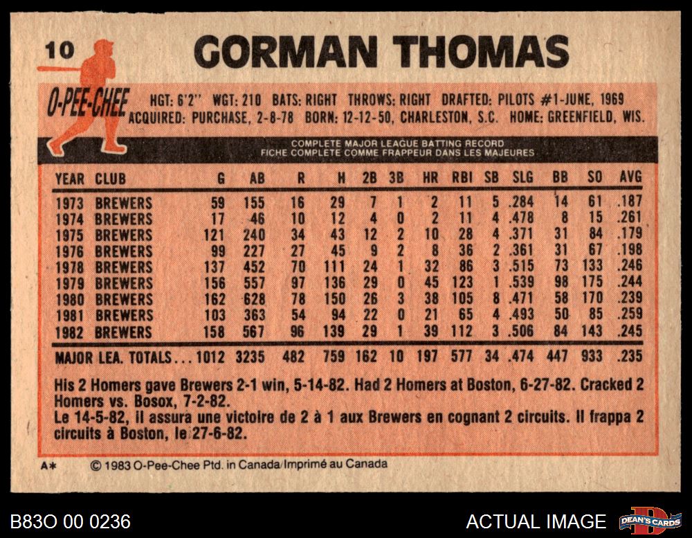 1983 O-Pee-Chee #10 Gorman Thomas