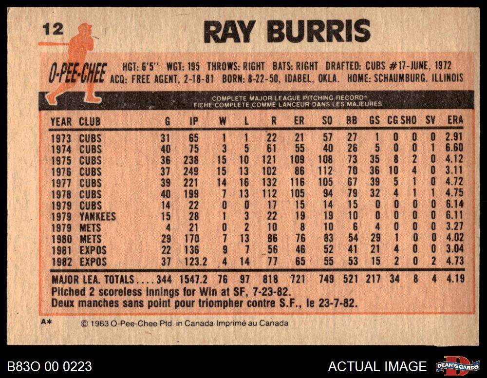 1983 O-Pee-Chee #12 Ray Burris 8 - NM/MT