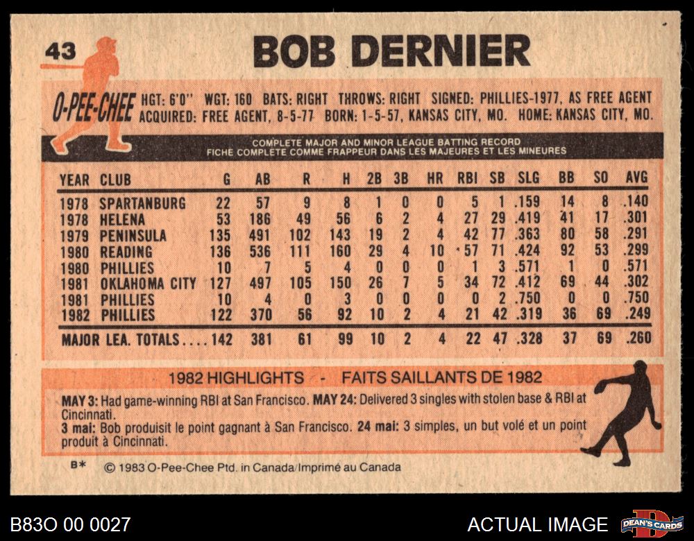 1983 O-Pee-Chee #43 Bob Dernier 8 - NM/MT
