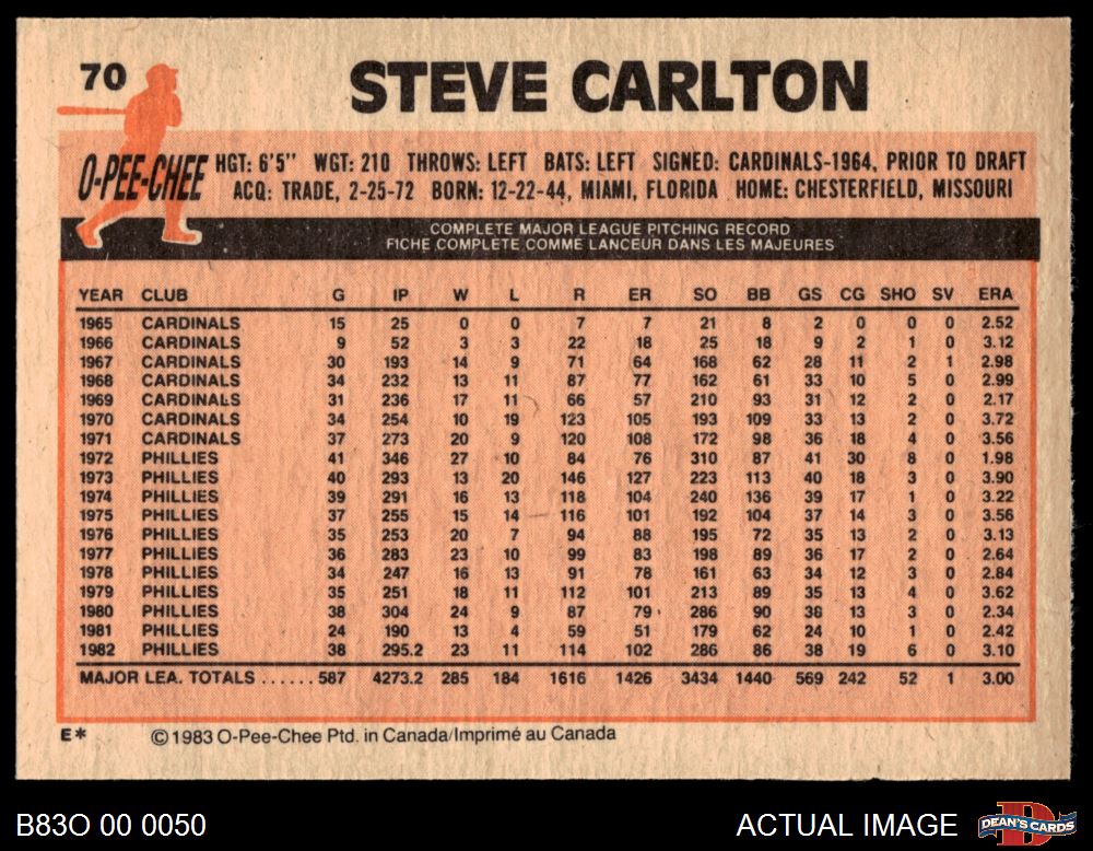 1983 O-Pee-Chee #70 Steve Carlton 8 - NM/MT