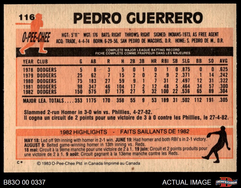 1983 O-Pee-Chee #116 Pedro Guerrero 8 - NM/MT
