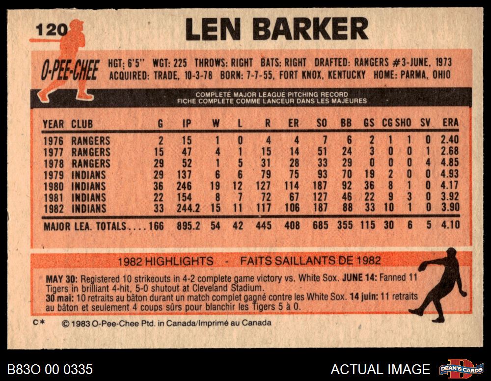 1983 O-Pee-Chee #120 Len Barker 8 - NM/MT