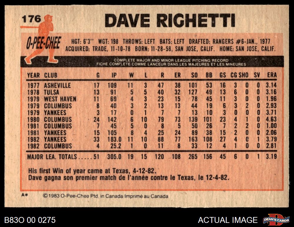 1983 O-Pee-Chee #176 Dave Righetti 8 - NM/MT