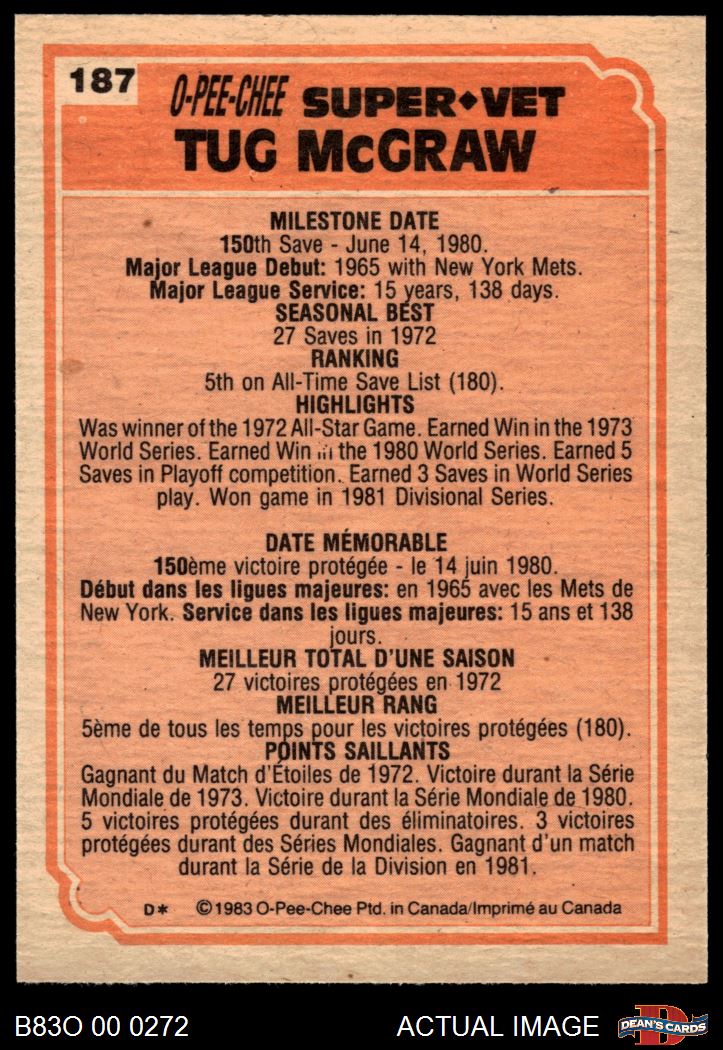 1983 O-Pee-Chee #187 - Tug McGraw Super Veteran 8 - NM/MT