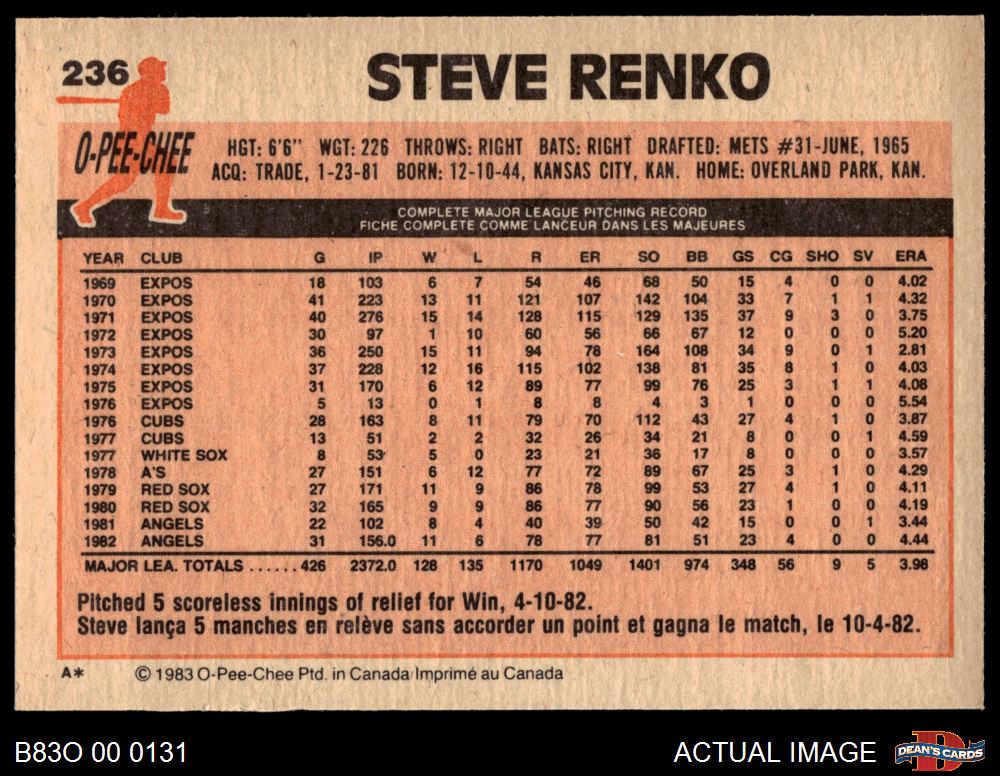 1983 O-Pee-Chee #236 Steve Renko 8 - NM/MT