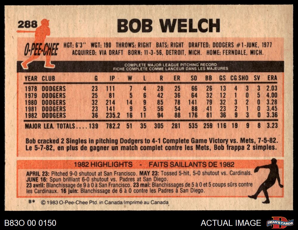 1983 O-Pee-Chee #288 Bob Welch 8 - NM/MT