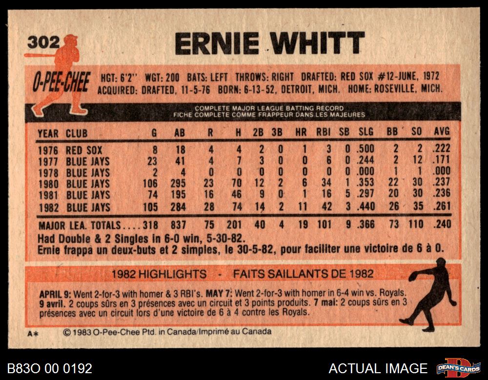 1983 O-Pee-Chee #302 Ernie Whitt 8 - NM/MT