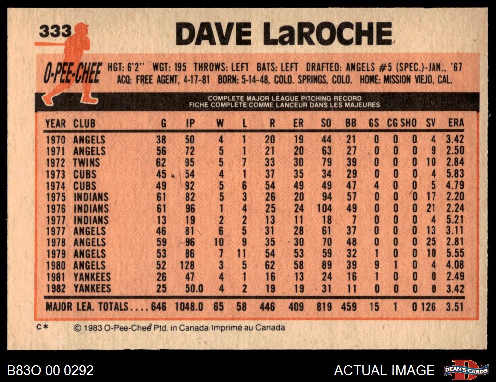 1983 O-Pee-Chee #333 Dave LaRoche 8 - NM/MT
