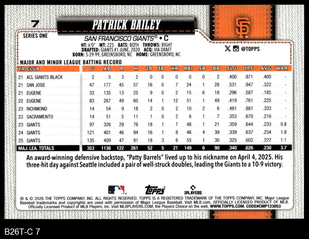 2026 Topps #7 Patrick Bailey 8 - NM/MT
