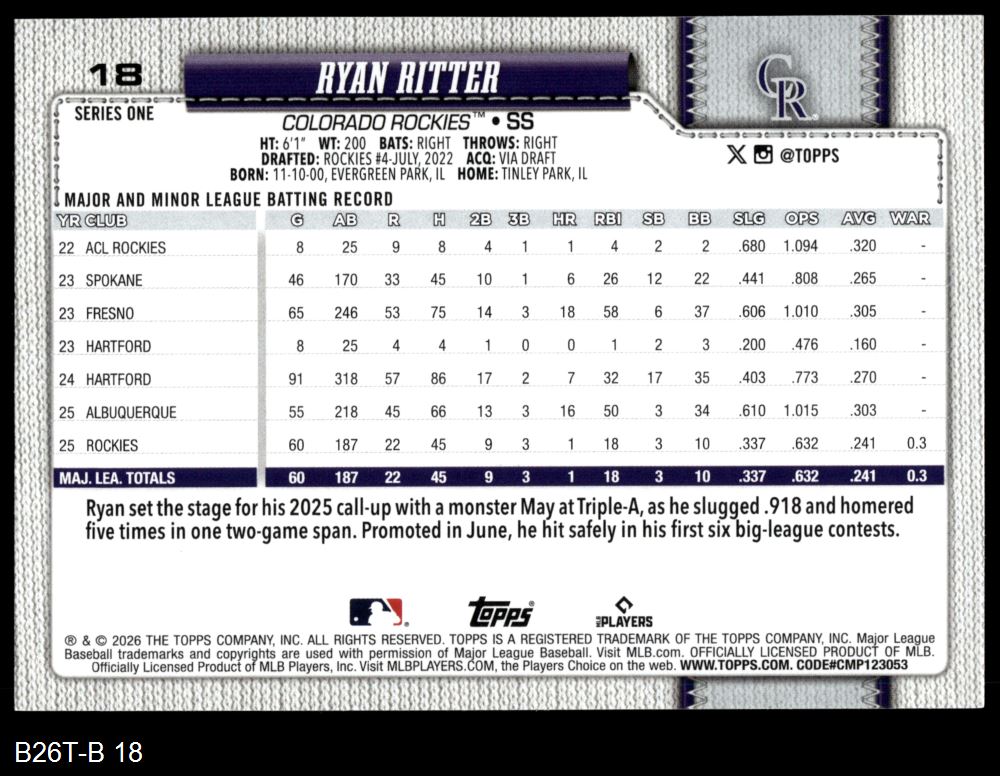2026 Topps #18 Ryan Ritter 8 - NM/MT