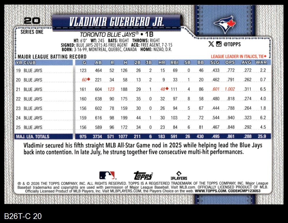 2026 Topps #20 Vladimir Guerrero Jr. 8 - NM/MT