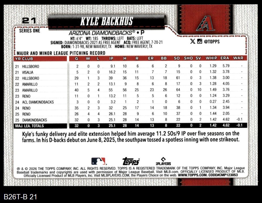 2026 Topps #21 Kyle Backhus 8 - NM/MT