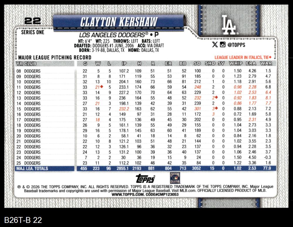2026 Topps #22 Clayton Kershaw 8 - NM/MT