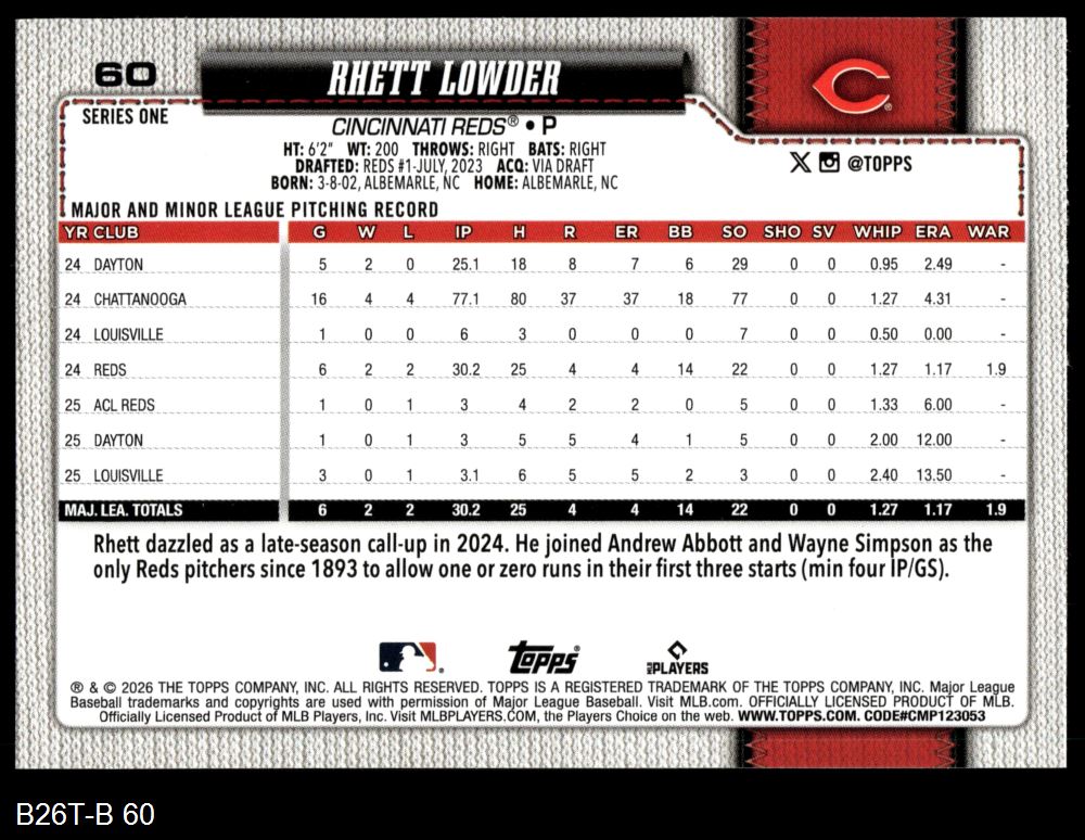 2026 Topps #60 - Rhett Lowder Future Stars 8 - NM/MT