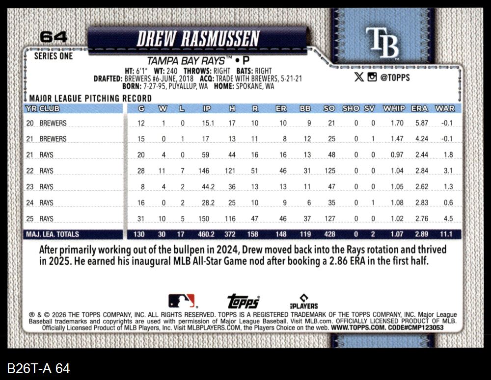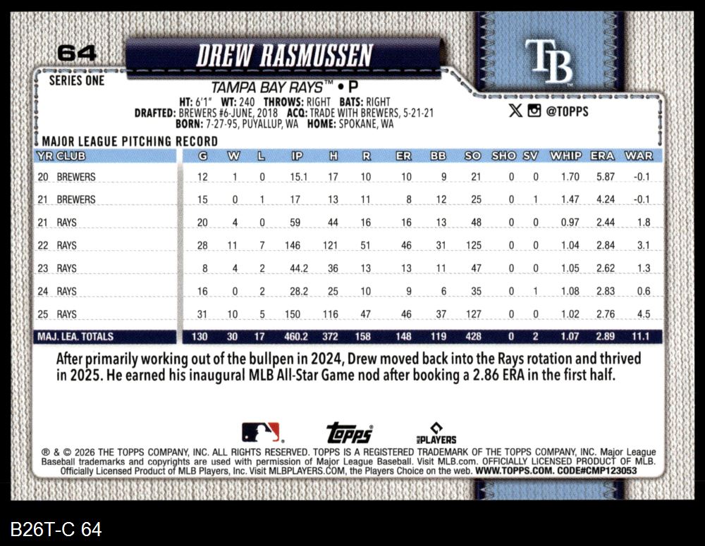 2026 Topps #64 Drew Rasmussen 8 - NM/MT