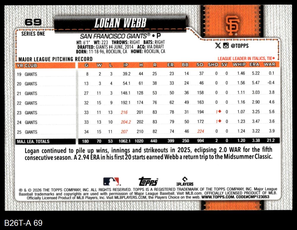 2026 Topps #69 Logan Webb 8 - NM/MT
