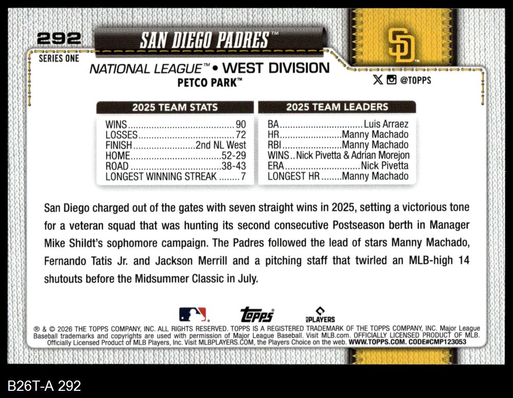 2026 Topps #292 San Diego Padres Team